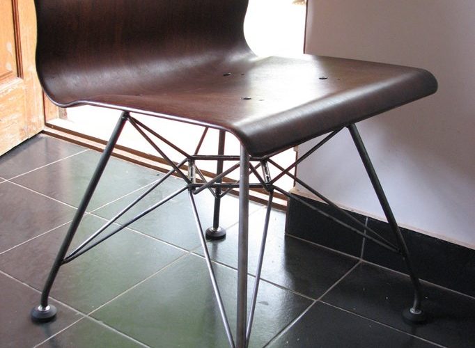 we had this wonderful seat from western india plywood, kannur…and this my first go at welding out one of charles eames leg structure. the leg structure was made in mild steel pipes and rods…finsihed with scotch brite pads and spray coated in duco water clear